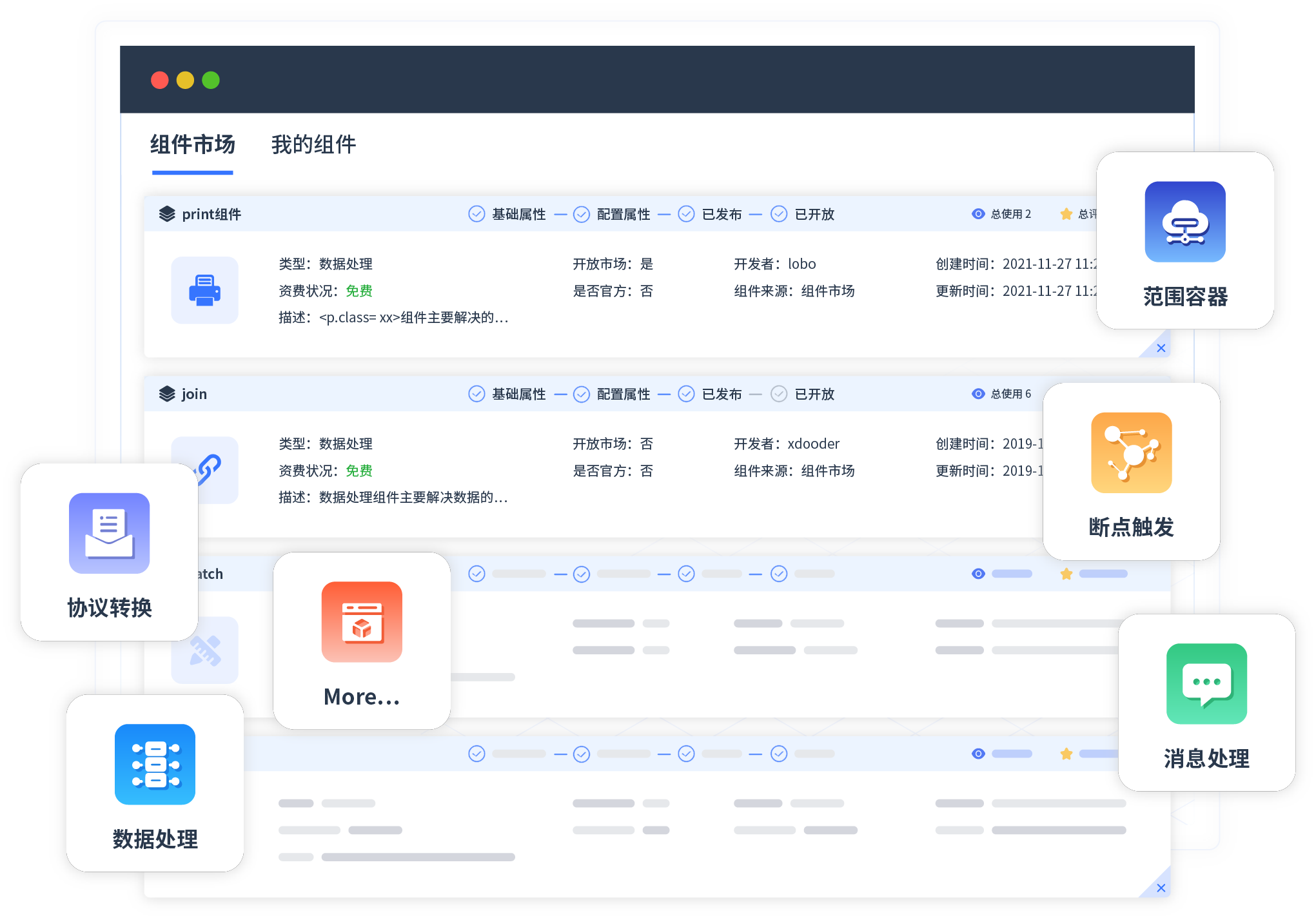 针对集成场景,百人牛牛赚钱游戏提供组件市场,例如协议转换、消息处理、文件操作等。除平台提供的组件外,客户可以自定义所需组件。